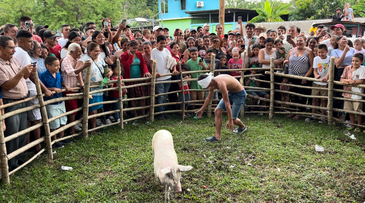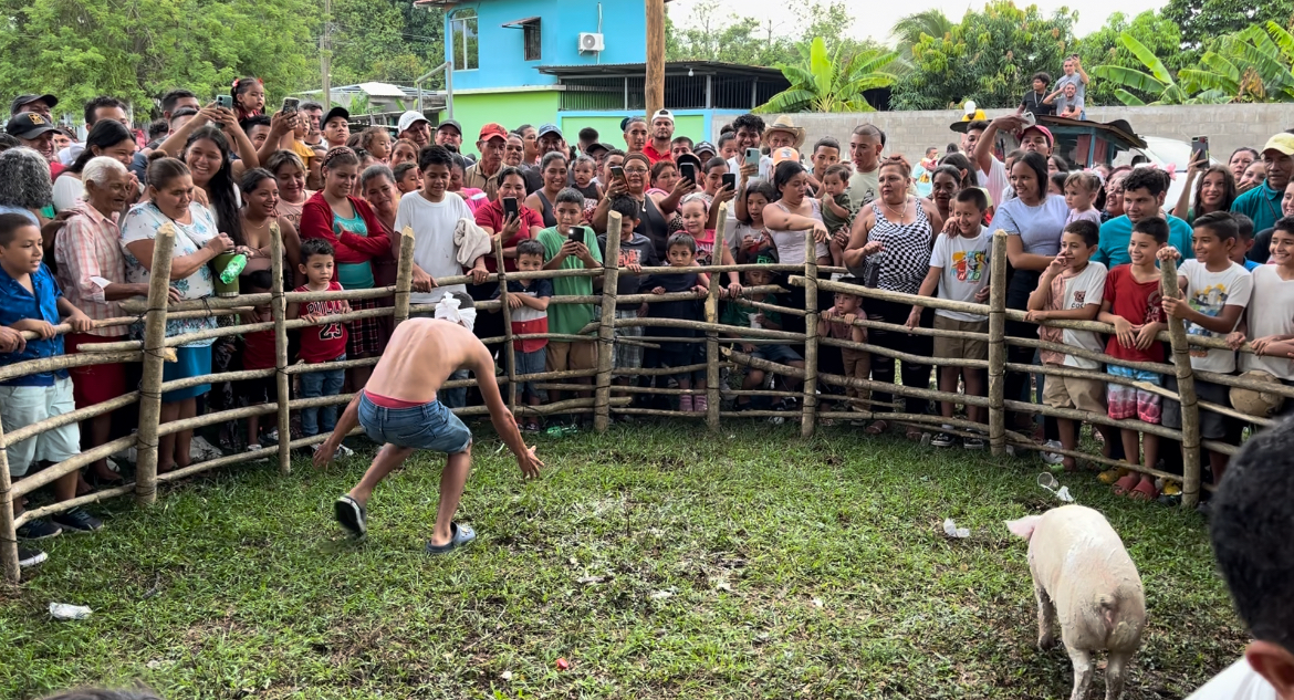 Lomitas del Este-Con mucha alegría se vivió con la competencia del cerdo encebado,una tradición que ir no se termina en esta Comunidad,varios niños participaron y una gran cantidad de pobladores llegaron para divertirse.