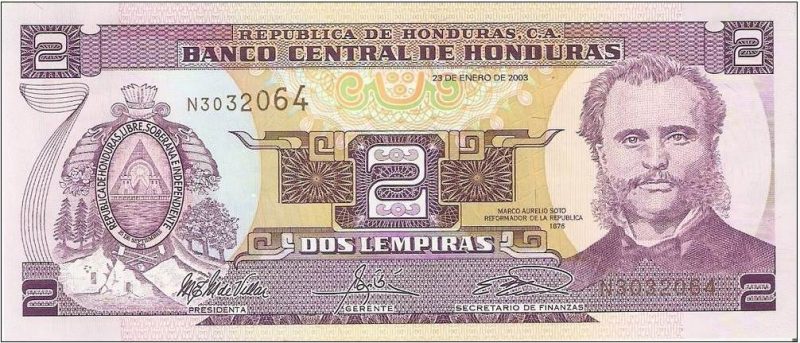 Marco Aurelio Soto, destacado político y presidente de Honduras en el siglo XIX, es la figura que adorna el billete de 2 lempiras. Este billete fue diseñado por el Banco Central de Honduras en 1976 y emitido por primera vez en 1978, rindiendo homenaje a uno de los líderes más influyentes en la modernización del país.