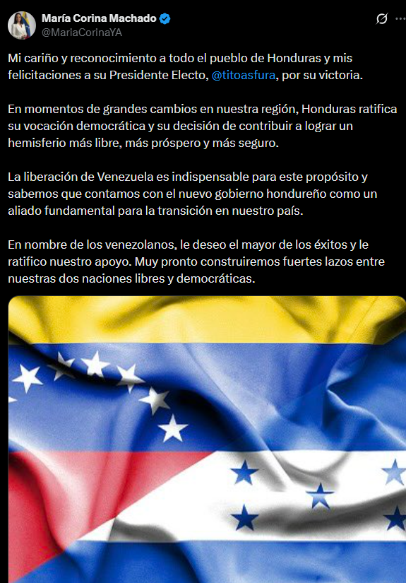 A través de un mensaje publicado en su red social X, Machado expresó su reconocimiento a Honduras por contribuir a la construcción de un hemisferio más libre, próspero y seguro, al tiempo que envió un mensaje directo de felicitación al mandatario electo por su triunfo en las urnas.
