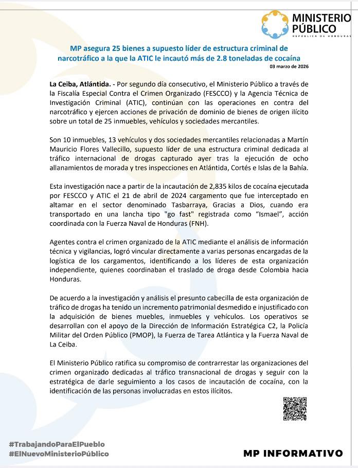 Las diligencias se derivan de la incautación de 2,835 kilos de cocaína realizada el 21 de abril de 2024 en el sector de Tasbarraya, en el departamento de Gracias a Dios. El cargamento era transportado en una embarcación tipo “go fast” denominada “Ismael”, en una operación coordinada con la Fuerza Naval de Honduras.