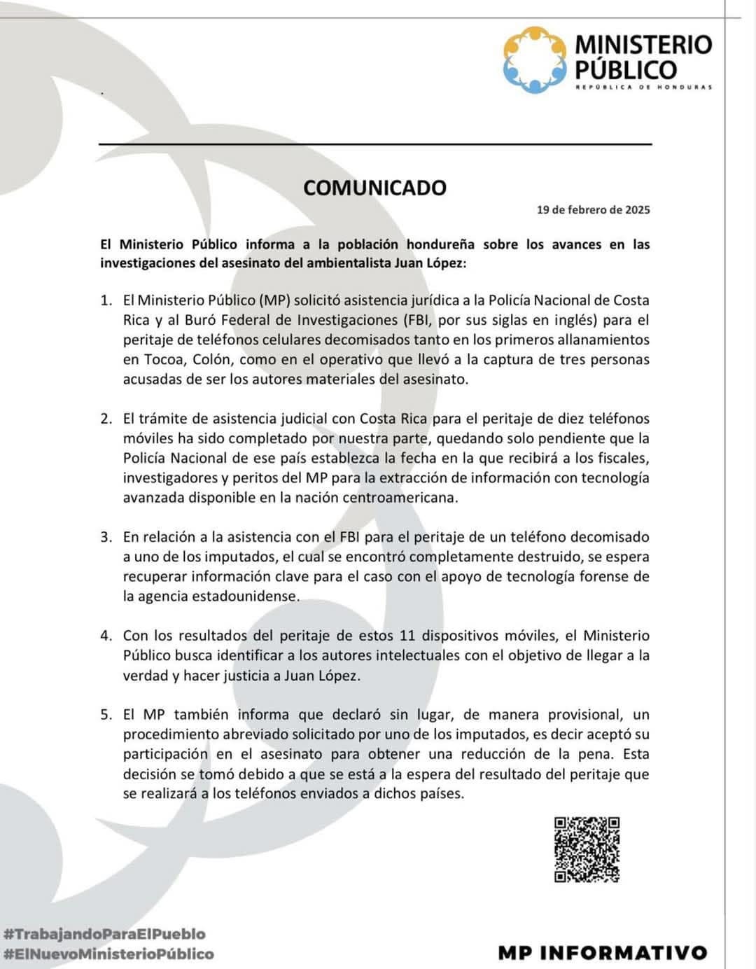 Tegucigalpa. El Ministerio Público a solicitado asistencia jurídica a la Policía Nacional de Costa Rica y al Buró Federal de Investigaciones (FBI) para llevar a cabo el peritaje de varios teléfonos celulares incautados durante la investigación del asesinato del líder ambientalista Juan López.