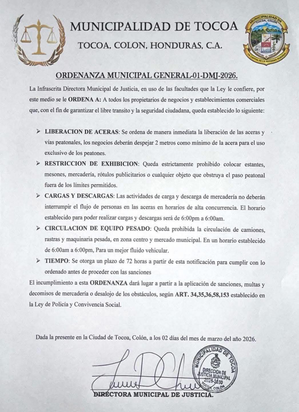La Municipalidad de Tocoa emitió la Ordenanza Municipal General 01-DMJ-2026, una normativa que busca fortalecer el ordenamiento urbano, garantizar el libre tránsito y mejorar la seguridad ciudadana en la ciudad.
