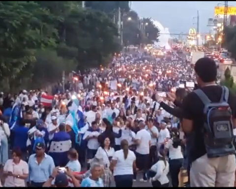 Tegucigalpa. Con sus emblemáticas antorchas en mano, portando banderas y pancartas los hondureños exigen además un cese al gobierno del “Narco Familión” como ilustran algunas de las pancartas. Adultos y jóvenes rechazan la reciente determinación de la mandataria de poner fin a
