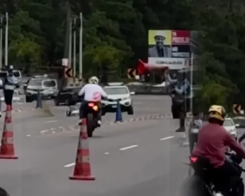 Un video que se ha viralizado en redes sociales muestra el momento en que un agente de la Dirección Nacional de Vialidad y Transporte (DNVT) lanza un cono de señalización hacia un motociclista en movimiento, provocando que este pierda el control y