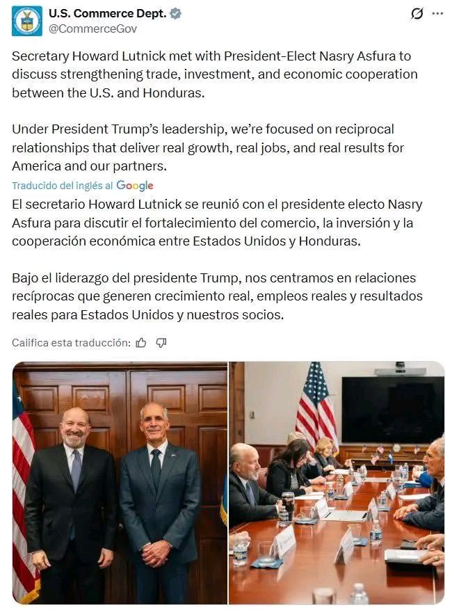 El presidente electo de Honduras, Nasry Asfura, sostuvo este lunes una reunión en Washington con el secretario de Comercio de Estados Unidos, Howard Lutnick, con el objetivo de fortalecer los lazos comerciales, la inversión y la cooperación económica entre ambos países.