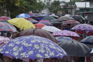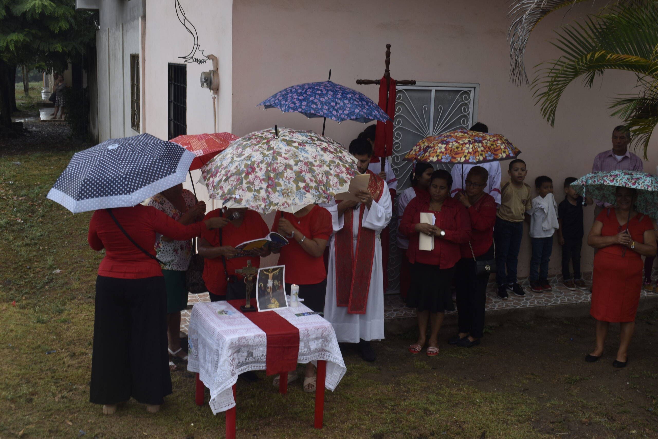 Cuando meditaban en la décima primera estación, donde Jesús es clavado en la cruz, la lluvia sorprendió a los fieles, un momento que se volvió más reflexivo con este signo. Las sombrillas, pronto se abrieron y el panorama en la calle que lleva a la cruz del perdón, cambió, y aparecieron los charcos de agua.