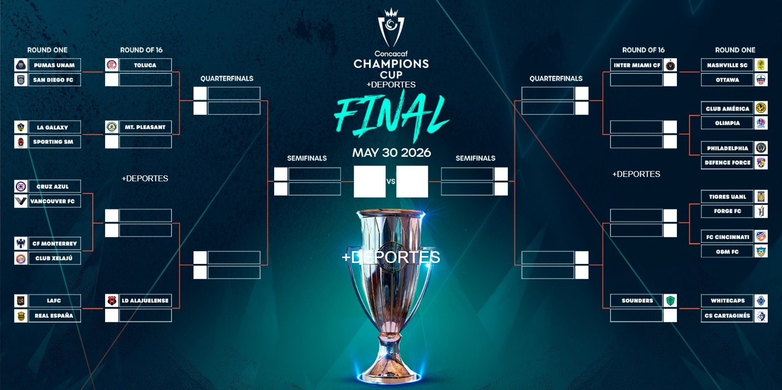 Los campeones de las tres copas regionales de Concacaf – LD Alajuelense, Mount Pleasant FA y Seattle Sounders FC – así como Deportivo Toluca FC, monarca de la Liga MX con más puntos acumulados, e Inter Miami CF, campeón de la MLS Cup, han recibido un pase directo a los Octavos de Final en reconocimiento a su mérito deportivo.
