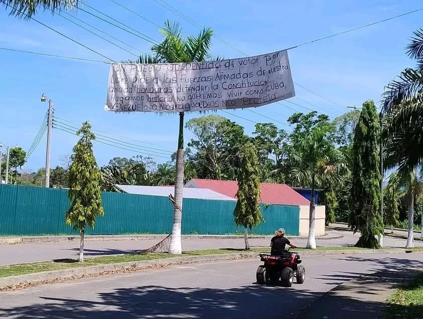 Este acto ha generado controversia y es motivo de debate entre los habitantes de la zona. La pancarta, que parece ser una crítica al actual modelo político, hace un llamado explícito a las Fuerzas Armadas de Honduras para que protejan la Constitución del país.