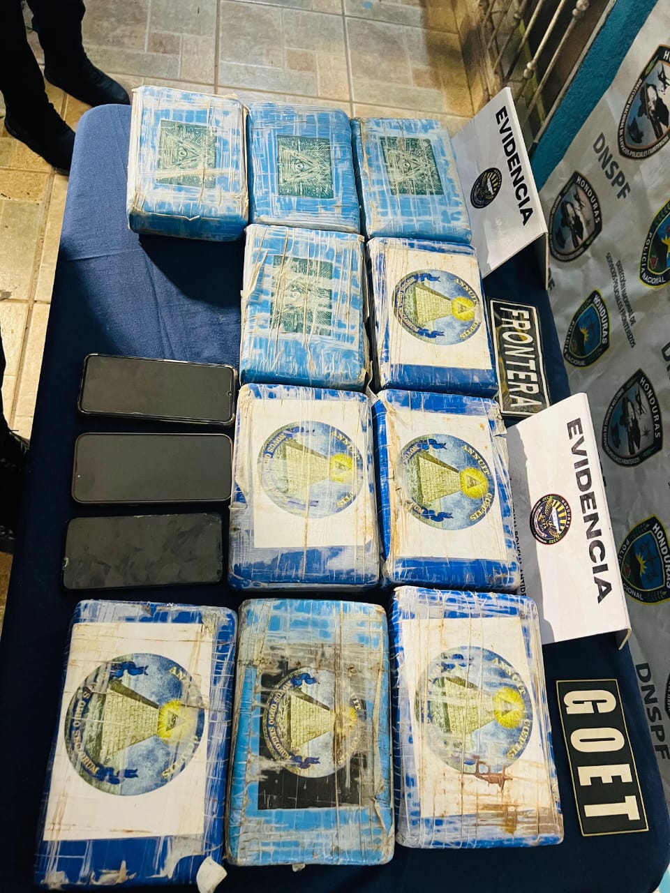 Santa Rosa de Aguan -En una operación conjunta liderada por la Dirección Nacional Policial Antidrogas (DNPA), con el apoyo de la Dirección Nacional de Prevención y Seguridad Comunitaria (DNPSC), la Dirección Nacional de Servicios Policiales Fronterizos (DNSPF) y la Dirección de Inteligencia Policial (DIPOL), se logró el decomiso de 10 kilogramos de supuesto clorhídrato de cocaína. La droga estaba identificada con la marquilla de «El ojo que todo lo ve».