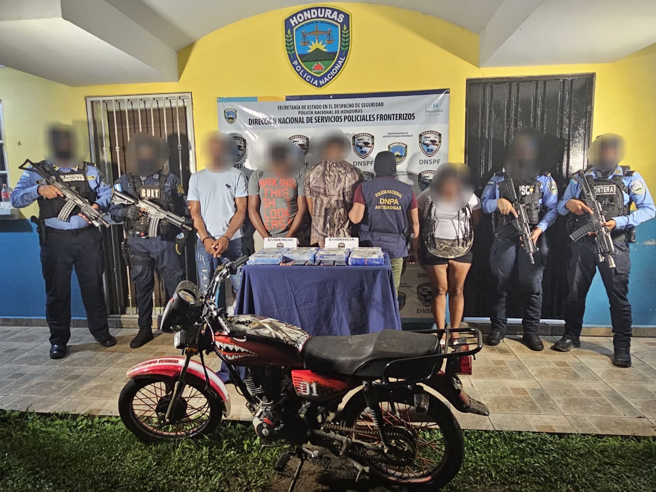 La acción se llevó a cabo en el desvío hacia la aldea Dos Bocas, municipio de Santa Rosa de Aguán, departamento de Colón. Durante la operación, se detuvo a cuatro personas, entre ellas una mujer originaria de El Progreso, Yoro, y tres hombres originarios del departamento de Colón. Además, se procedió al decomiso de una motocicleta y un vehículo tipo pick-up Toyota Tacoma, presuntamente utilizados para el transporte y custodia de la sustancia ilícita.