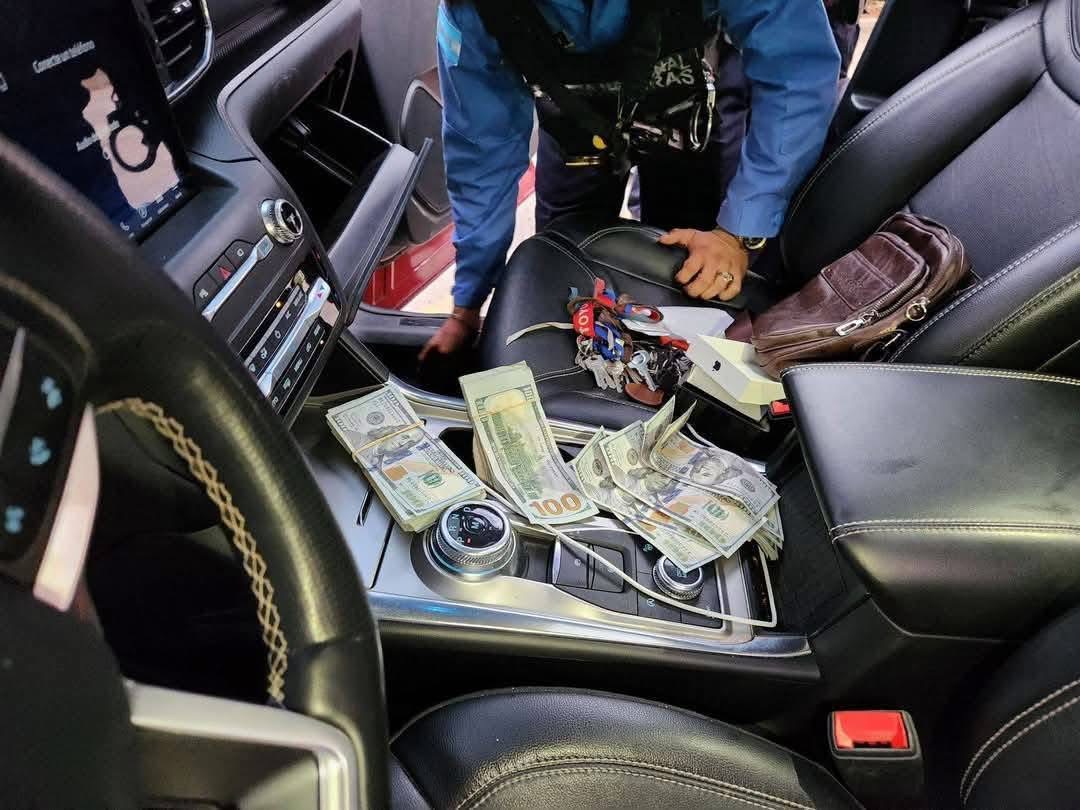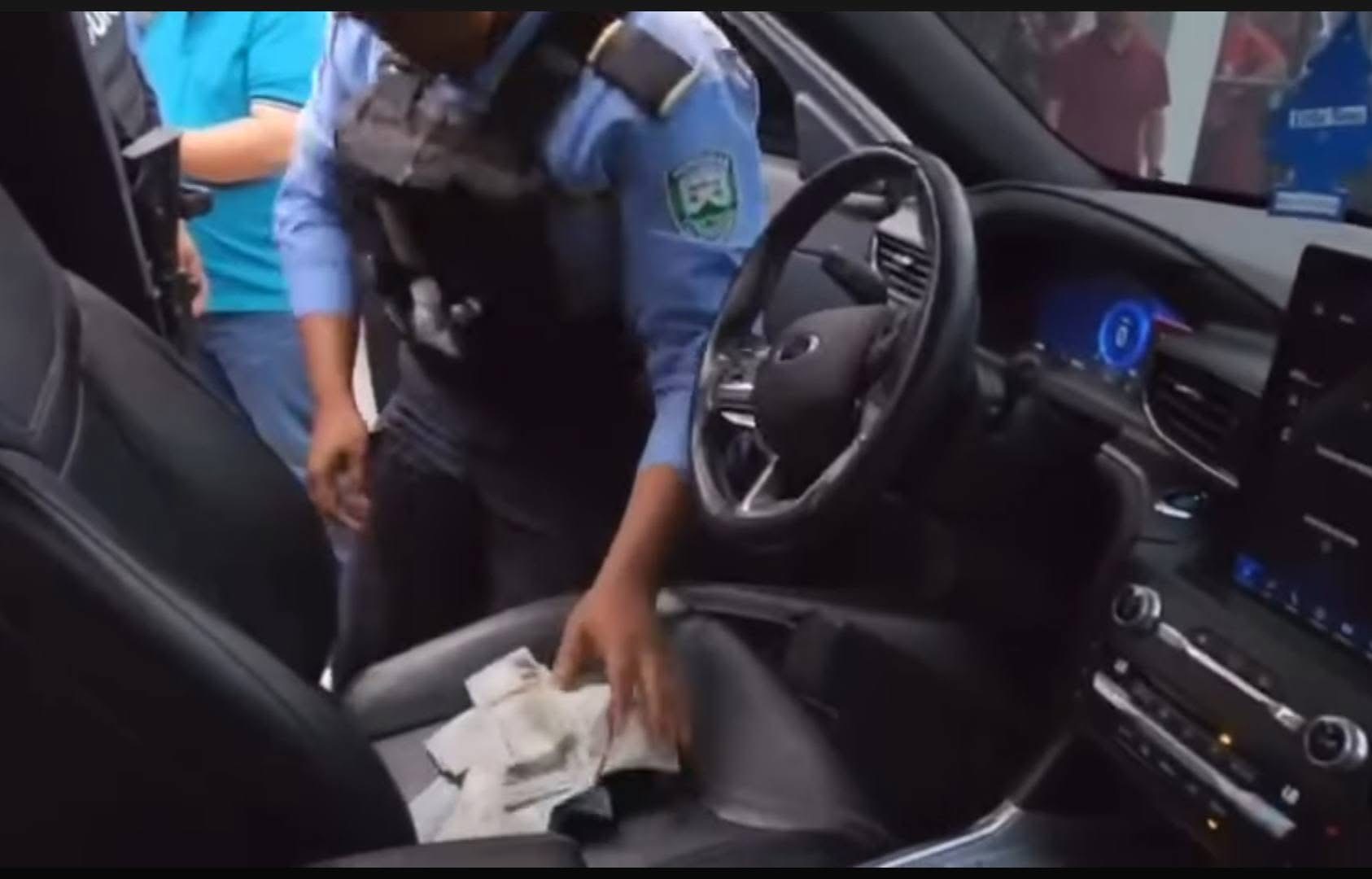 Así fue el momento en que la Policía Nacional inspeccionó el vehículo del administrador de Koriun Inversiones, Iván Velásquez, la tarde de este lunes, donde se encontraron 50 mil dólares y 4,137 lempiras en los compartimentos de las guanteras y alfombras del carro.