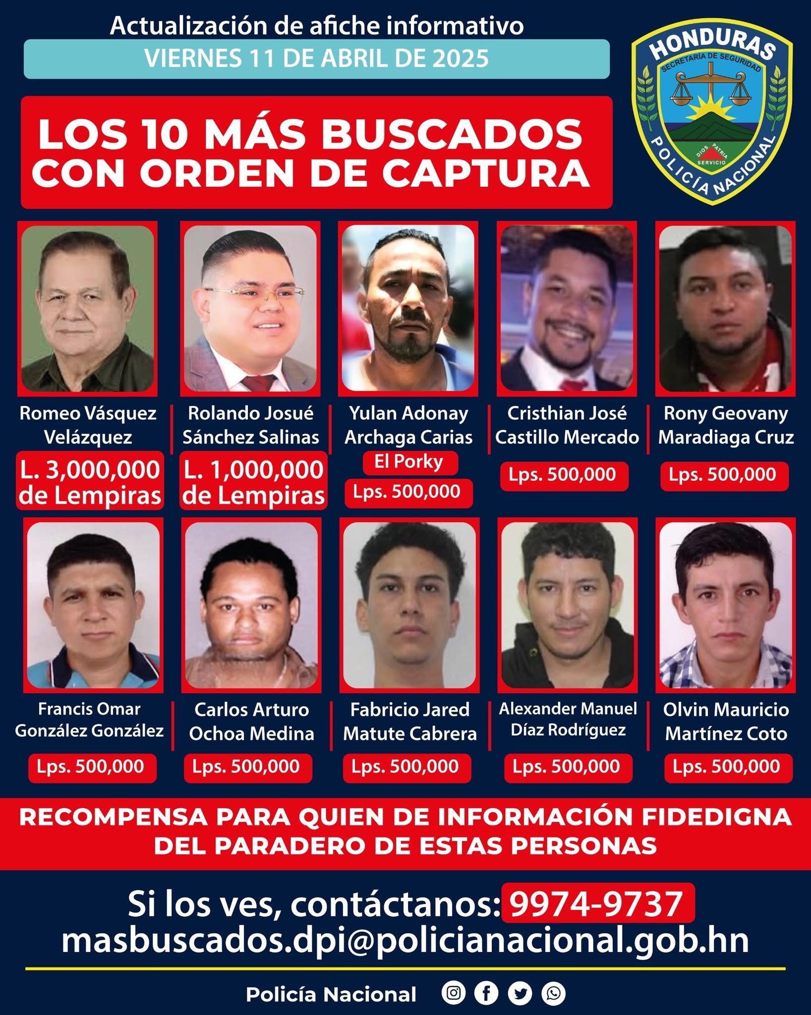 Tegucigalpa-La Policía Nacional de Honduras, a través de sus redes sociales, informó que aumentó a 3 millones de lempiras la recompensa para quien sepa el paradero del general en condición de retiro, Romeo Vásquez Velásquez.