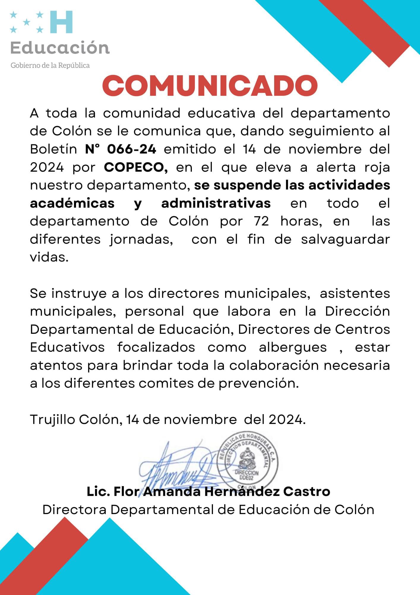 Colon – Mediante un comunicado la dirección departamental de educación , suspendió las actividades educativas debido a la alerta roja que hay en toda la zona .