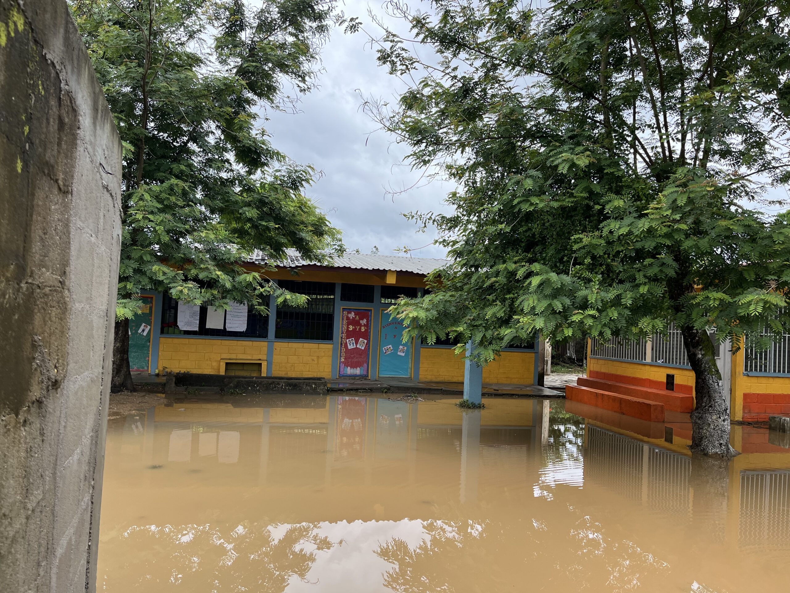 El acceso a la escuela Punta Caxinas de la Colonia Cholomeña amaneció inundado , los alumnos no pudieron llegar hasta su aula de clases .