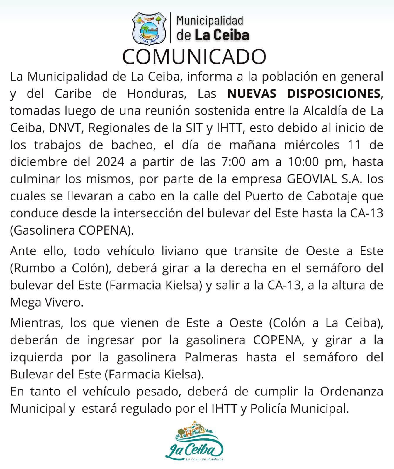 Mientras, los que vienen de Este a Oeste (Colón a La Ceiba), deberán de ingresar por la gasolinera COPENA, y girar a la izquierda por la gasolinera Palmeras hasta el semáforo del Bulevar del Este (Farmacia Kielsa).
