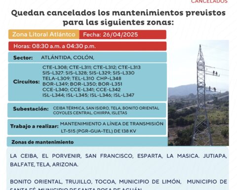 Colón, Honduras. — El próximo sábado, el departamento de Colón se quedará sin servicio de energía eléctrica durante gran parte del día. La interrupción está programada para iniciar a las 8:30 de la mañana y se extenderá hasta las 4:30 de la