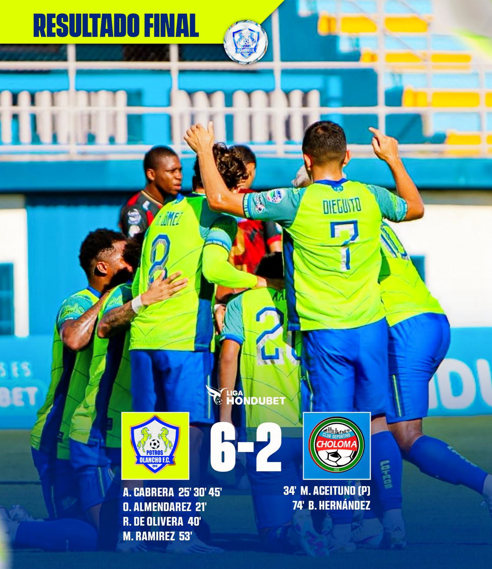 JUTICALPA.- Con un hat trick del sub-20 de Olancho, Yemerson Cabrera, Potros goleó 6-2 merecidamente al CD Choloma en duelo realizado en el estadio Juan Ramón Brevé Vargas.