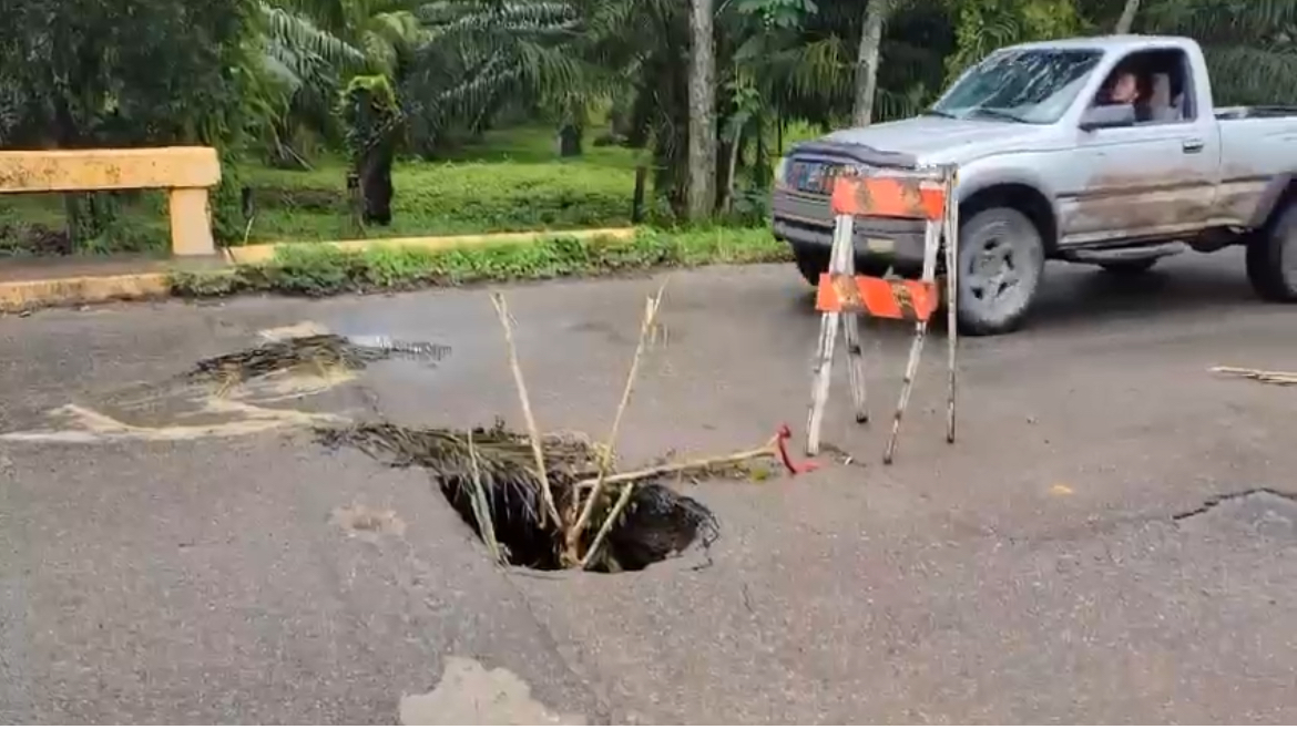 El enorme agujero es un peligro para los conductores que van hacia La Ceiba o que llegan al Valle del Aguan , producto de las constantes lluvias está socavando el acceso al puente .