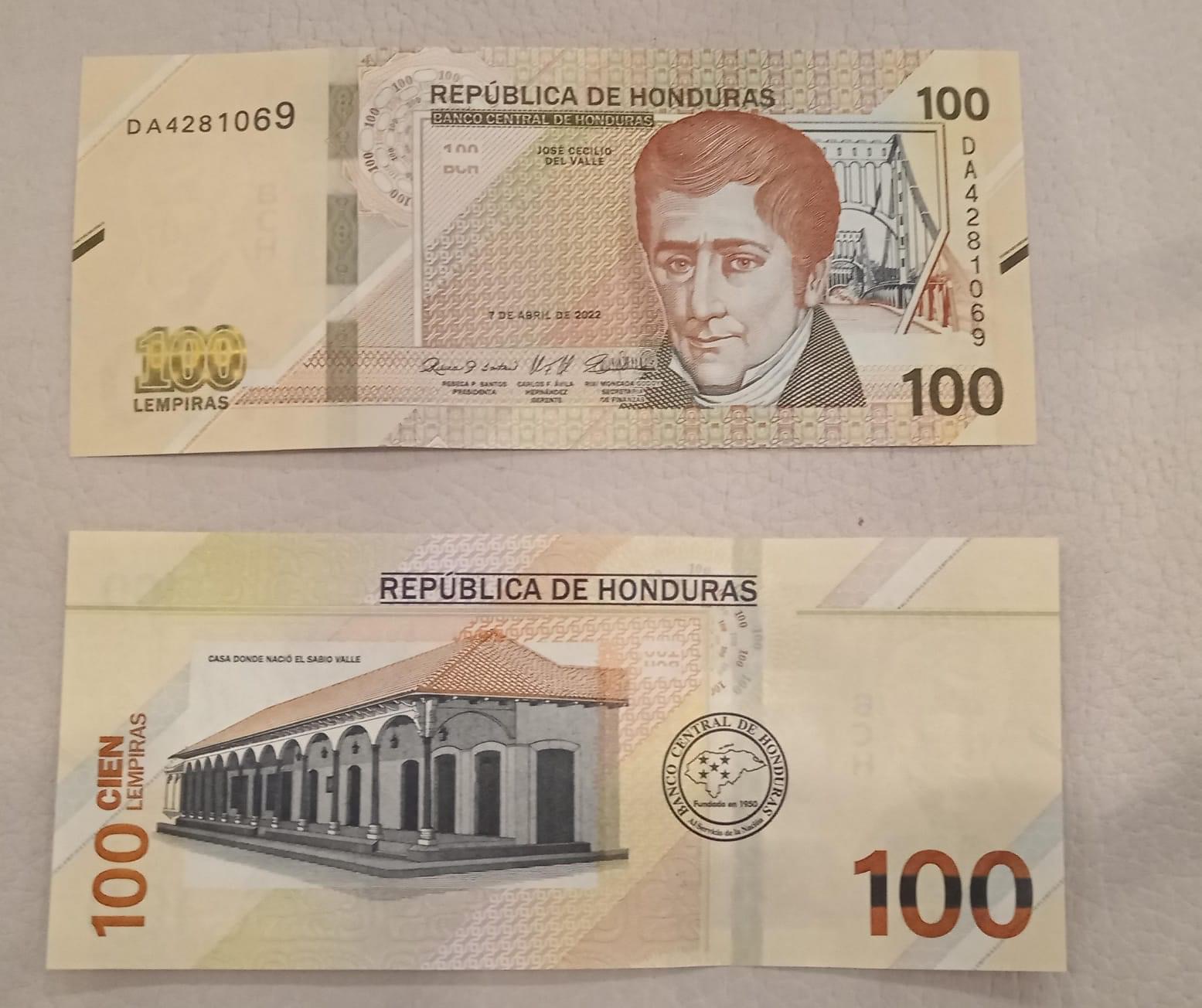 Según las imágenes divulgadas, el billete de 100 lempiras mantendrá la imagen de José Cecilio del Valle en su parte delantera, acompañada del puente de Choluteca. En la parte trasera, se conserva la representación de la casa de nacimiento del ‘Sabio’ Valle, aunque ambas imágenes serán reducidas en tamaño.
