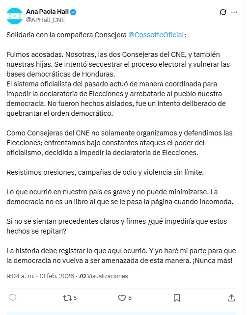 Ana Paola Hall, presidenta del Consejo Nacional Electoral (CNE), denunció públicamente a través de su cuenta oficial en la red social X que tanto ella como la consejera Cossette López fueron víctimas de acoso, en medio de lo que calificó como un intento deliberado de vulnerar el proceso electoral en Honduras.