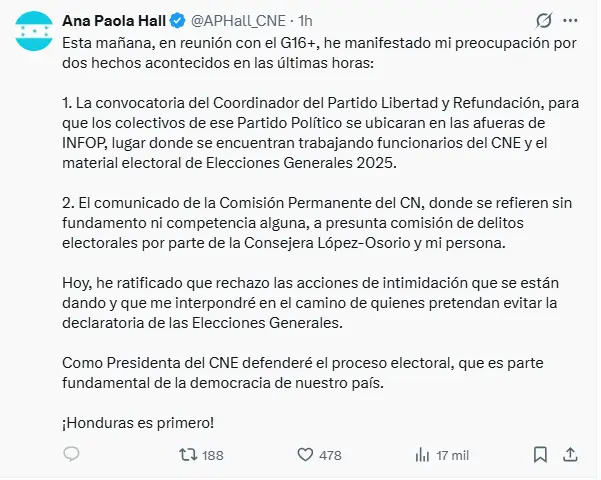 En un mensaje publicado en su cuenta de X, Hall expresó su “rechazo a las acciones de intimidación” y aseguró que no permitirá que ninguna presión externa obstaculice la conclusión oficial del proceso electoral.