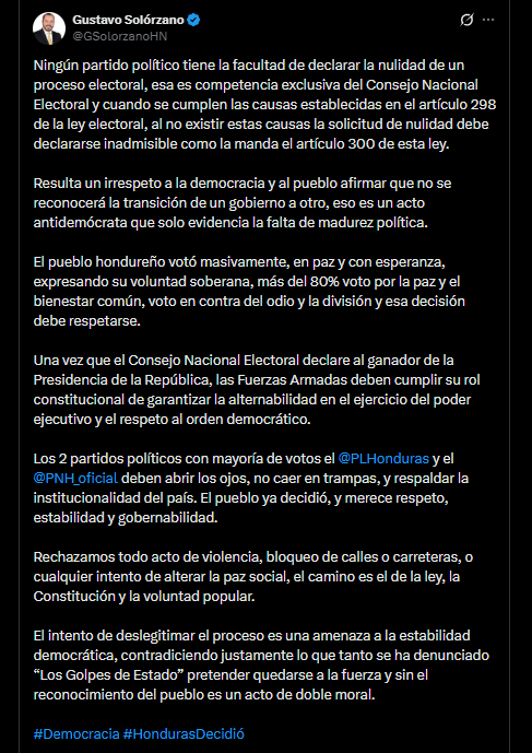 “El pueblo hondureño votó masivamente y en paz; esa voluntad soberana debe ser respetada”, enfatizó Solórzano, quien además indicó que, una vez el CNE declare al ganador de la Presidencia, las Fuerzas Armadas tienen la obligación constitucional de garantizar la alternabilidad y el respeto al orden democrático.