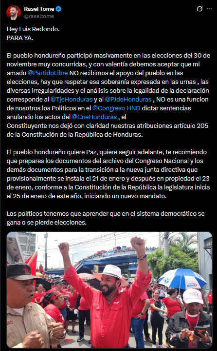 “Hey Luis Redondo, pará ya”, expresó Tomé al rechazar acciones que pudieran anular los resultados oficiales, subrayando que el pueblo hondureño se expresó de manera masiva el pasado 30 de noviembre y que su partido, Libre, no obtuvo el respaldo popular. “Con valentía debemos aceptar que mi amado Partido Libre no recibió el apoyo del pueblo; hay que respetar la soberanía expresada en las urnas”, declaró.