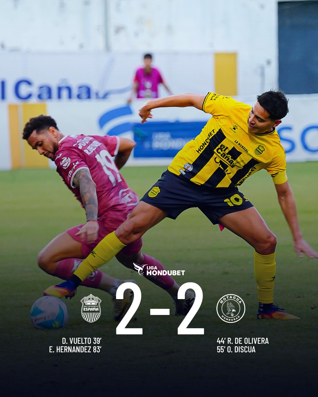En el complemento, Motagua adelantó sus líneas y Óscar Discua puso en ventaja a los visitantes al 55’. La “máquina” siguió presionando hasta conseguir un penal que Eddie Hernández transformó en gol al 83’, sellando el empate 2-2 y permitiendo que Real España mantuviera el primer lugar de la tabla de colocaciones.