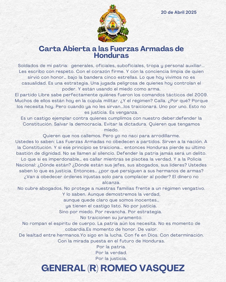 En su carta, Romeo Vásquez recordó a los cuerpos armados del país que su deber es con la patria y la Constitución, no con partidos políticos. «Las Fuerzas Armadas deben defender la democracia, no callar ante los abusos. Su lealtad es con el pueblo hondureño», enfatizó.