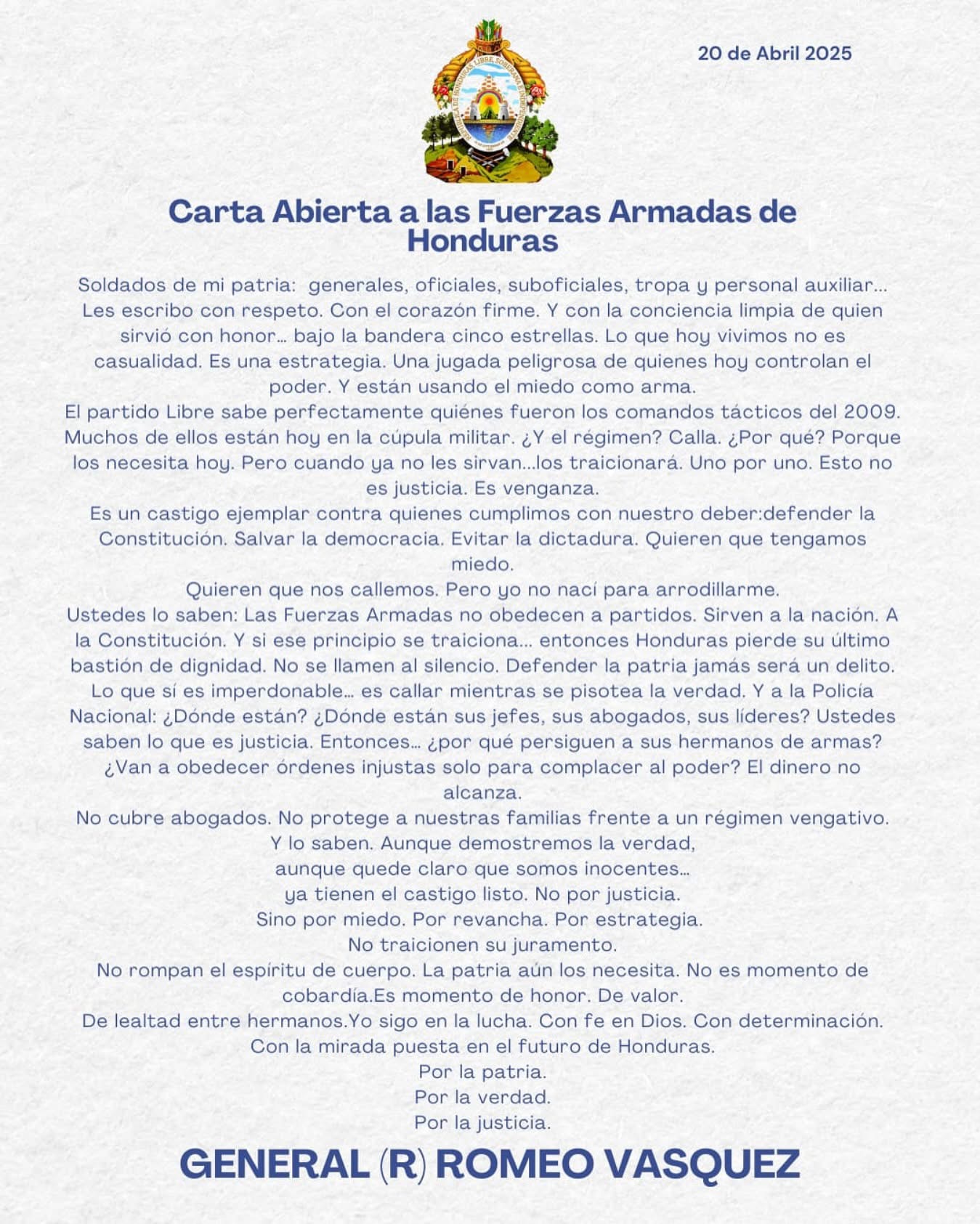 Romeo Vasquez envia carta a las Fuerzas Armadas