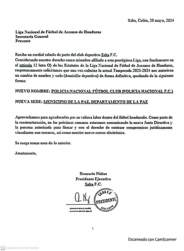 Sabá,Colón- De forma oficial el equipo Saba Fc solicitó a la liga de ascenso el cambio de sede y nombre para el campeonato que se viene,el equipo se llamará Policía Nacional FC y su sede será en La Paz, La Paz.