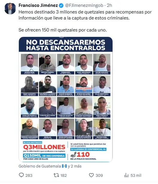 El Gobierno ofreció una recompensa de 3 millones de quetzales (150 mil por cada reo fugado) y mantiene más de 45 mil agentes desplegados en todo el país para dar con su paradero.