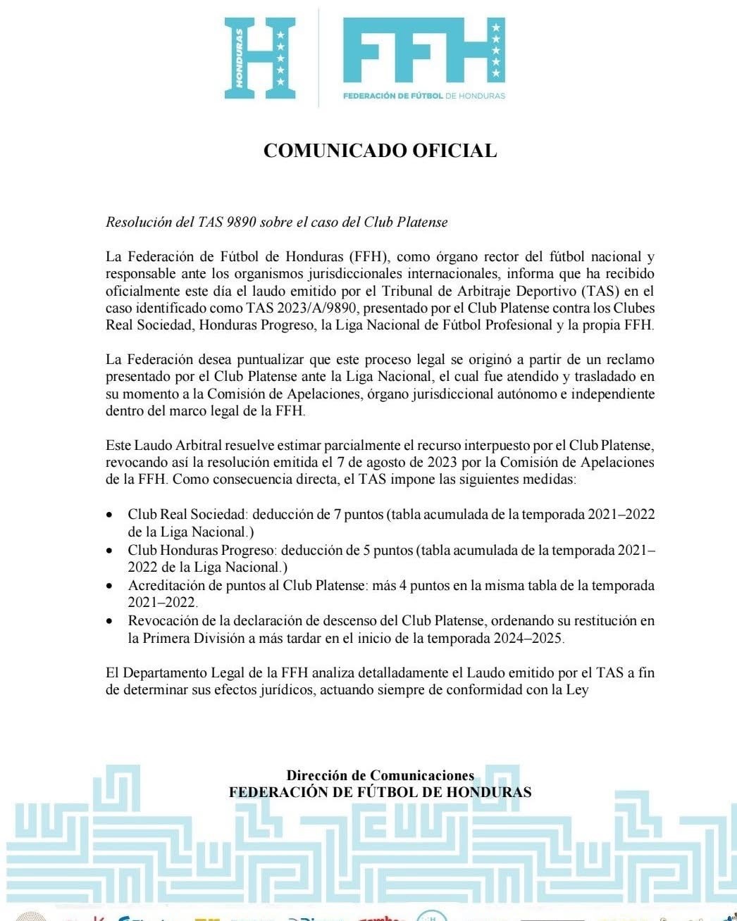 «La Federación como ente rector del Fútbol Hondureño informa que ha recibido oficialmente este día el laudo oficial del TAS presentado por el club Platense en contra de los clubes Real Sociedad, Honduras Progreso y el Club y Social Vida», anunciaron.