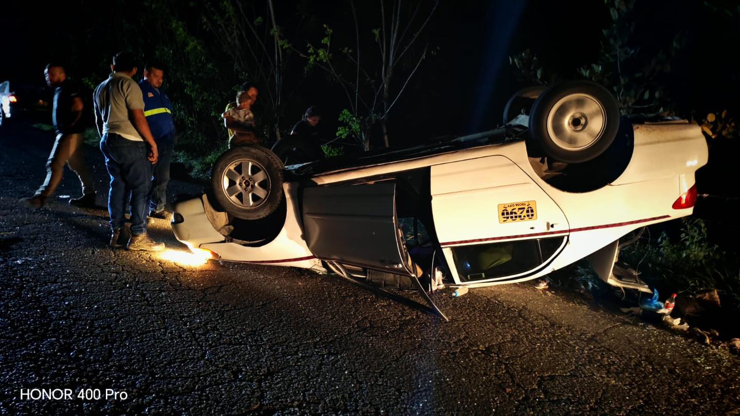 Un accidente vehicular se registró anoche en la carretera CA-13, específicamente entre los túmulos de Cayo Campo y el puente del río Guapinol, cuando un taxi cayó en un bache y terminó volcado a un costado de la vía.