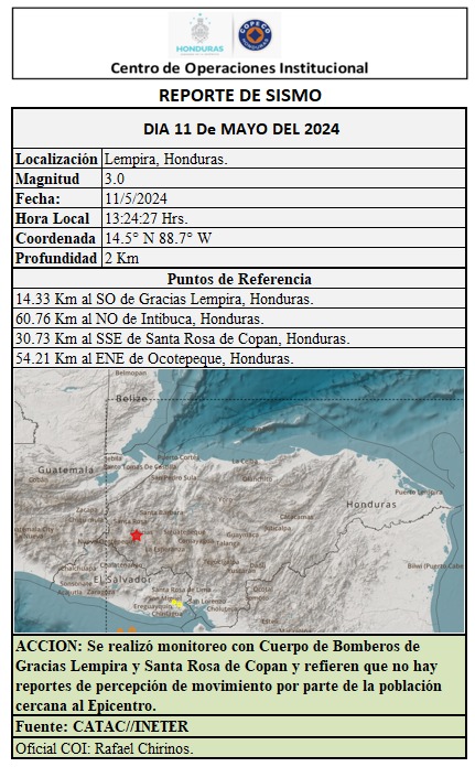 Segúnela Secretaría de Gestión de Riesgos, informó, que el ismo de magnitud 3.0, y profundidad 2 km, se localizó en el departamento de Lempira, a aproximadamente 14 km al suroeste de la ciudad de Gracias, cabecera de esta región.
