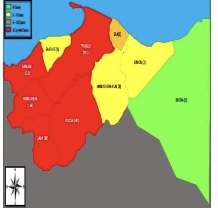 La aldea Chrurrusquera en Sonaguera , Quebrada de Arena en Tocoa  , Rio Esteban en Balfate ,pero sobre todo Achiote y Barranco Chele en Saba es donde mas casos reportan .