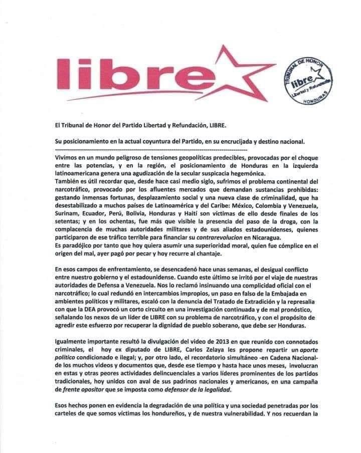 Tegucigalpa- Tribunal de Honor de Libre acepta la renuncia de Carlos Zelaya, “El exdiputado Carlos Zelaya ya presentó a la Asamblea Nacional de Libre su renuncia al partido… ya no tenemos jurisdicción sobre su caso”, menciona el comunicado.