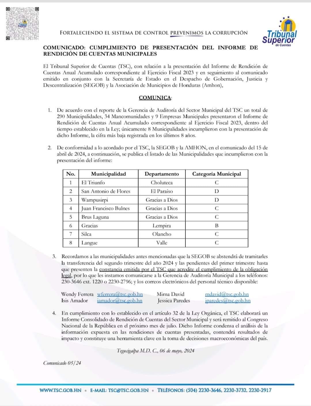 Tegucigalpa- El Tribunal Superior de Cuenta (TSC), dio a conocer este lunes que, de las 298 alcaldías, ocho municipalidades no presentaron su informe de rendición de cuentas correspondiente al ejercicio fiscal 2023, por tanto, “no podrán acceder a las transferencias municipales”, dijo Rodolfo Isaula, jefe de comunicaciones del TSC.