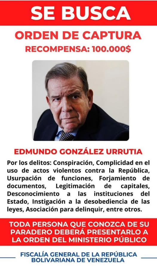 La administración de Nicolás Maduro ha anunciado ofrecimiento de una recompensa de $100 mil dólares estadounidenses por la captura del líder opositor venezolano, Edmundo González Urrutia.
