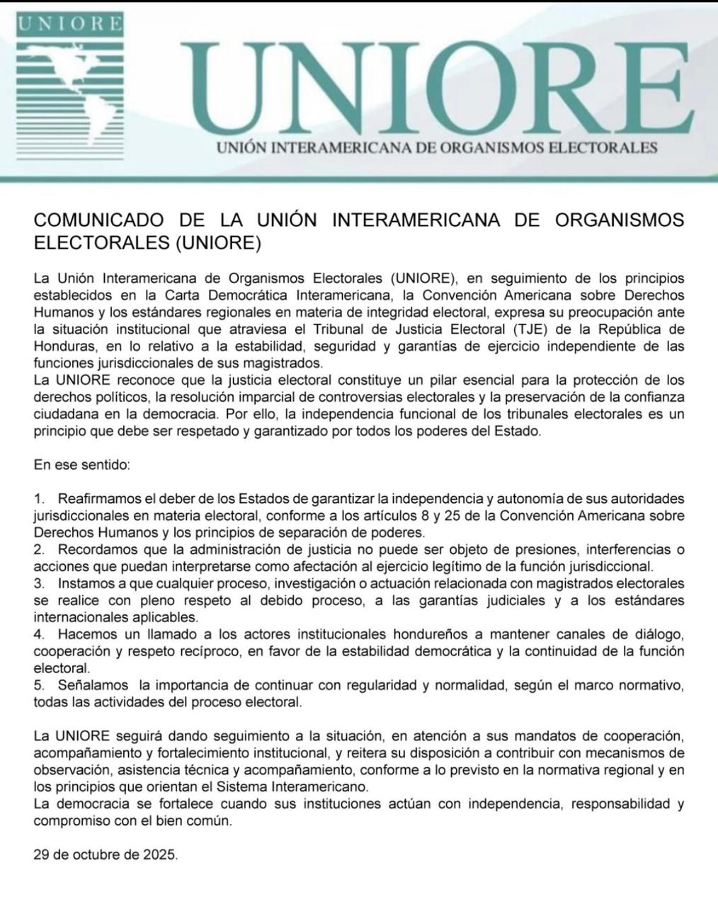 La Unión Interamericana de Organismos Electorales (Uniore) expresó este jueves su respaldo a los magistrados del Tribunal de Justicia Electoral (TJE) de Honduras, Mario Flores Urrutia y Miriam Barahona, quienes recientemente han sido señalados por sus resoluciones en los casos de inscripción en los departamentos de Olancho y Valle.