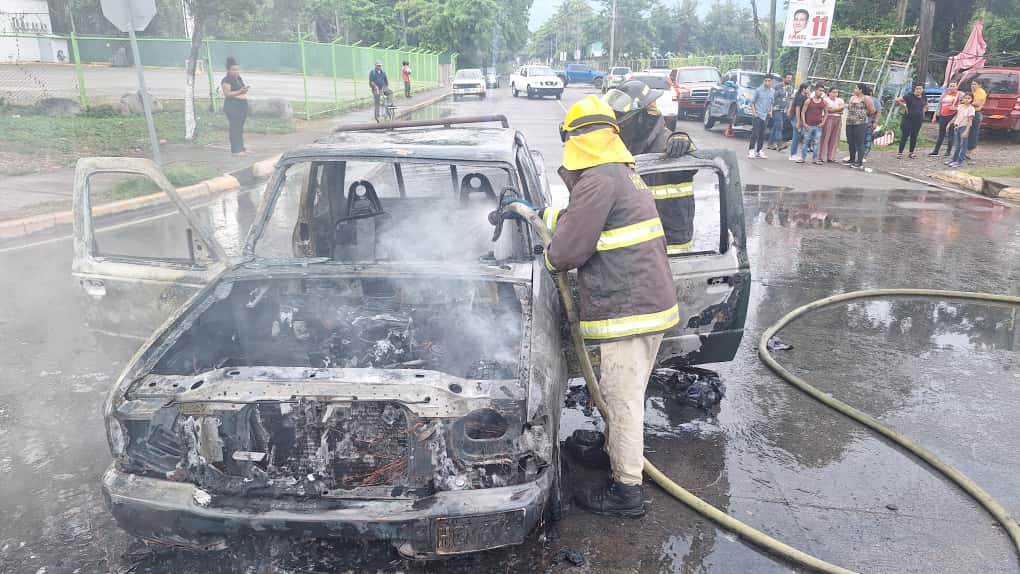 Un vehículo fue consumido por completo por las llamas este jueves en la calle 8 de La Ceiba, Atlántida, mientras una familia se dirigía a comprar bloques para la construcción de una fosa de un ser querido que estaban velando.