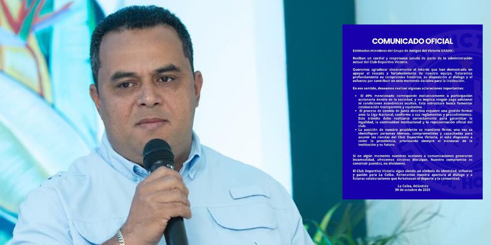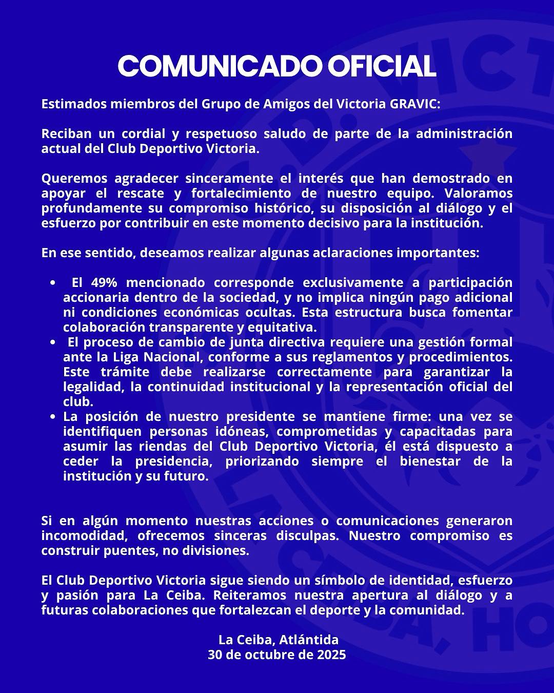 El Victoria de La Ceiba, que ha estado en crisis administrativa e incluso se mencionó que el presidente Javier Cruz había dado un paso al costado, pero hoy enviaron un comunicado aclarando la realidad del equipo ceibeño.