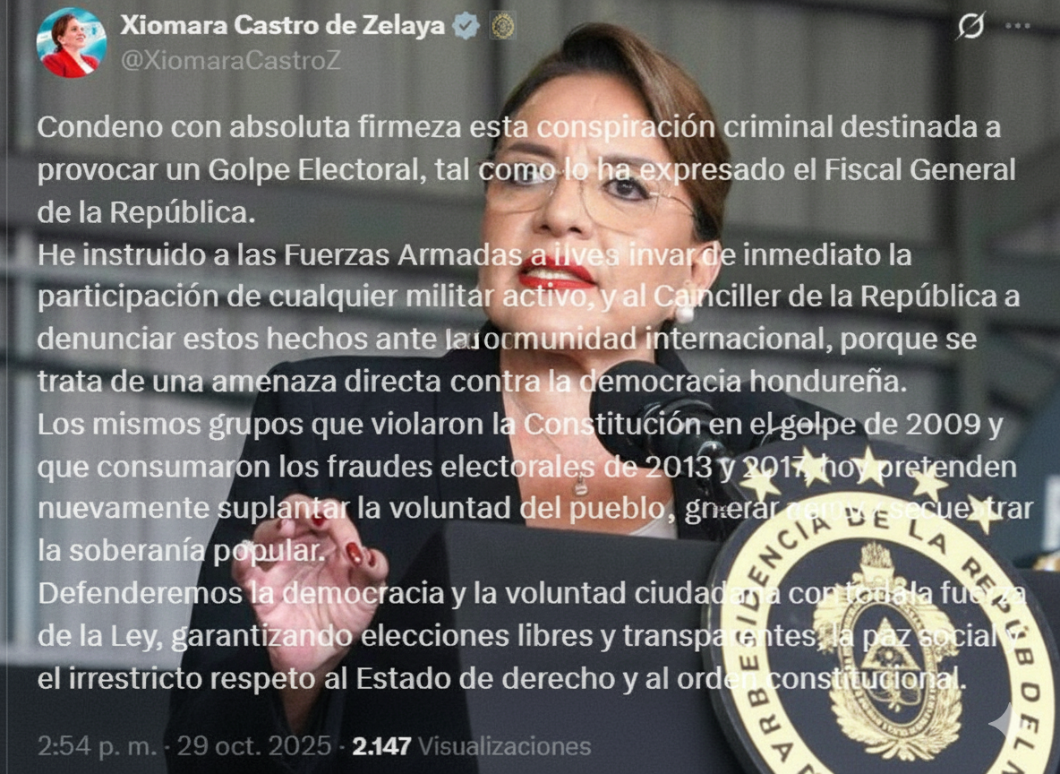 La presidenta de Honduras, Xiomara Castro, lanzó una grave denuncia al afirmar que existe una “conspiración criminal” orientada a provocar un golpe electoral en el país. En un contundente mensaje, la mandataria advirtió que no permitirá que “se atente contra la democracia hondureña ni contra la voluntad del pueblo”.