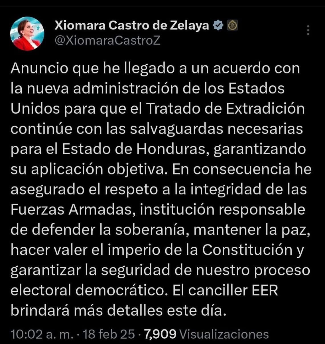 «Anuncio que he llegado a un acuerdo con la nueva administración de los Estados Unidos para que el Tratado de Extradición continúe con las salvaguardas necesarias para el Estado de Honduras, garantizando su aplicación objetiva», subrayó Castro en un mensaje en X.