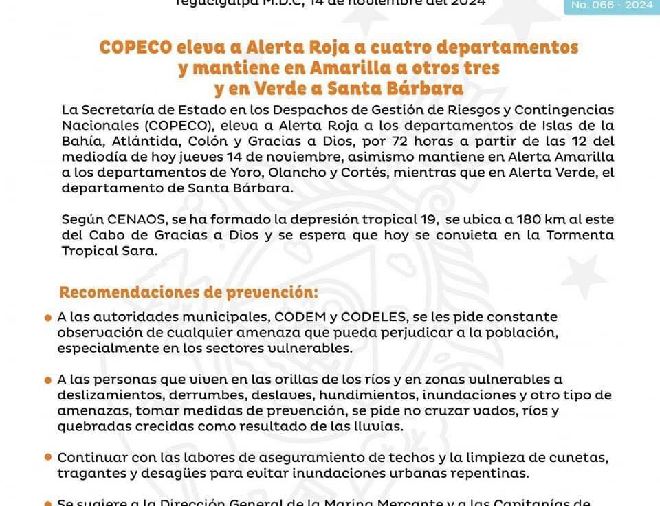 Colón – ya están en alerta roja cuatro departamentos, Colón,Islas de la Bahía , Atlántida y Gracias a Dios , las lluvias son constantes en estos departamentos.
